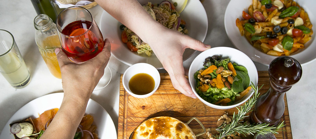 Salmon gravlax acompañado de rúcula, zucchini asado, cebolla morada, berenjena asada, frutos secos, queso crema con aceite de oliva, miel y ciboulette.